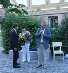 Für die Familie sprach Andreas Fuchs dem Heimatverein und besonders Ursula und Karl Hirschmann tiefen Dank aus dafür, dass sie die Kunstwerke seines im Hilpoltsteiner Ortsteil Auhof geborenen Vaters hier präsentieren. „Aber: Wo ist die Kunst unseres Vaters daheim? Sie passt sich den Räumen an, für die er sie schuf. Eigentlich sind sie dort daheim. Ich freue mich, wenn die Kunstwerke unseres Vaters als Teil der Heimat betrachtet werden.“ Bent Schwarz vom Ausschuss des Heimatvereins überreichte Ursula und Karl Hirschmann Blumen und Flüssiges als Dank für deren großen Einsatz für die Ausstellung.