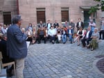 Unter den Leihgebern hob Hirschmann besonders die evangelische Kirchengemeinde Roth hervor, die aus der Stadtkirche Altarmensa, Taufgestell, zwei Lesepulte und den Meditationsleuchter zur Verfügung stellte. Pfarrer Peter Goertz erläuterte, dass dies nur möglich sei, weil die Kirche derzeit für das Kirchenjubiläum im kommenden Jahr renoviert wird. Er denke, dass es wohl in keiner anderen Stadt so viele Fuchs-Kunstwerke gebe wie in Roth, wo in Stadtkirche, Krankenhaus, Friedhof und Seniorenheim meist jeweils mehrere Kunstwerke zu bewundern sind. „Sein Werk dokumentiert seinen tiefen Glauben. Dafür bin ich ihm sehr dankbar.“ Der frühere Pfarrer von Heilsbronn Paul Geißendörfer, ein Freund des bescheidenen Künstlers, betonte, dass dessen Werke die Verwurzelung im Glauben zeigen. Für die mittelalterliche Münsterkirche in Heilsbronn habe der Interpret der biblischen Botschaft drei Werke geschaffen.